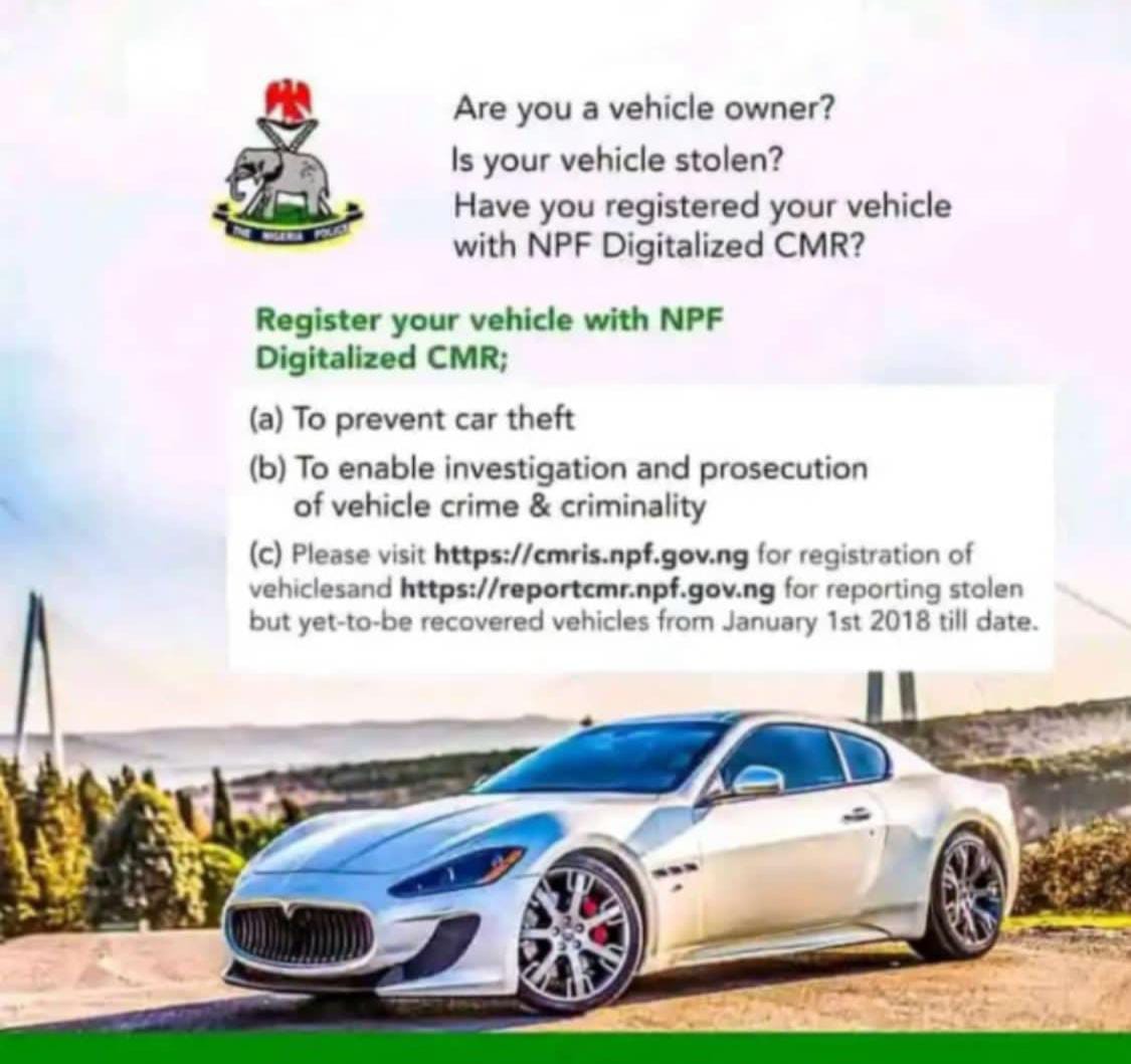 He said that residents could alternatively visit the CMR portal via https://cmris.npf.gov.ng to apply and ensure the utmost security and safety of their vehicles.